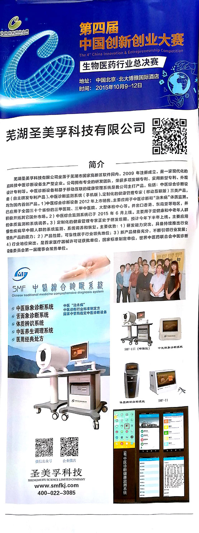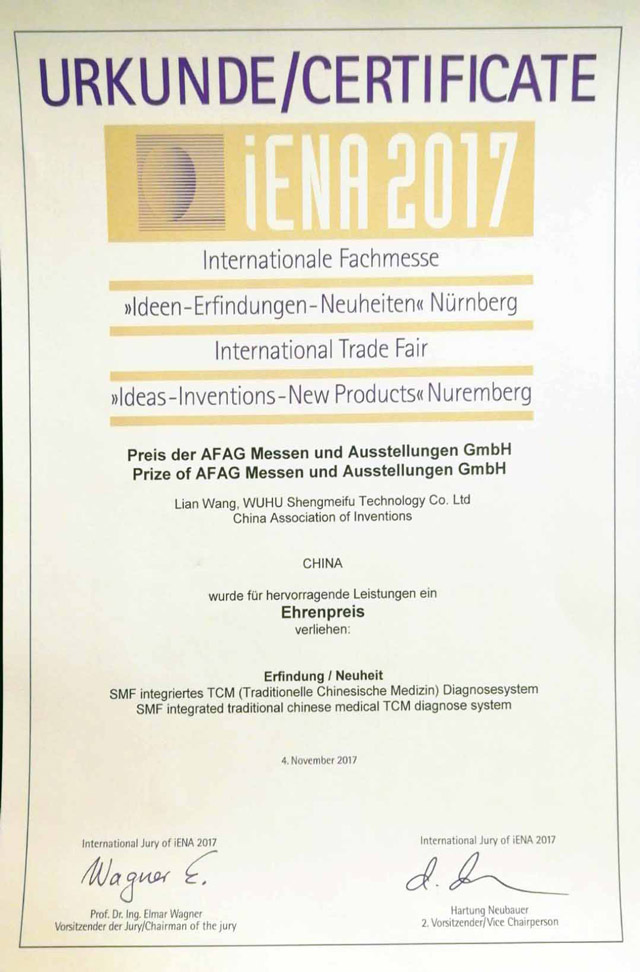 2015年,“中醫(yī)脈象診斷系統(tǒng)”、“SMF中醫(yī)舌面象儀”兩項產(chǎn)品入選全國衛(wèi)生產(chǎn)業(yè)管理協(xié)會首批“治未病服務(wù)適宜設(shè)備”;
