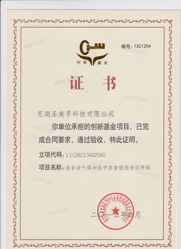 全自動氣體加壓中醫智能脈象儀研制創新基金項目驗收證書